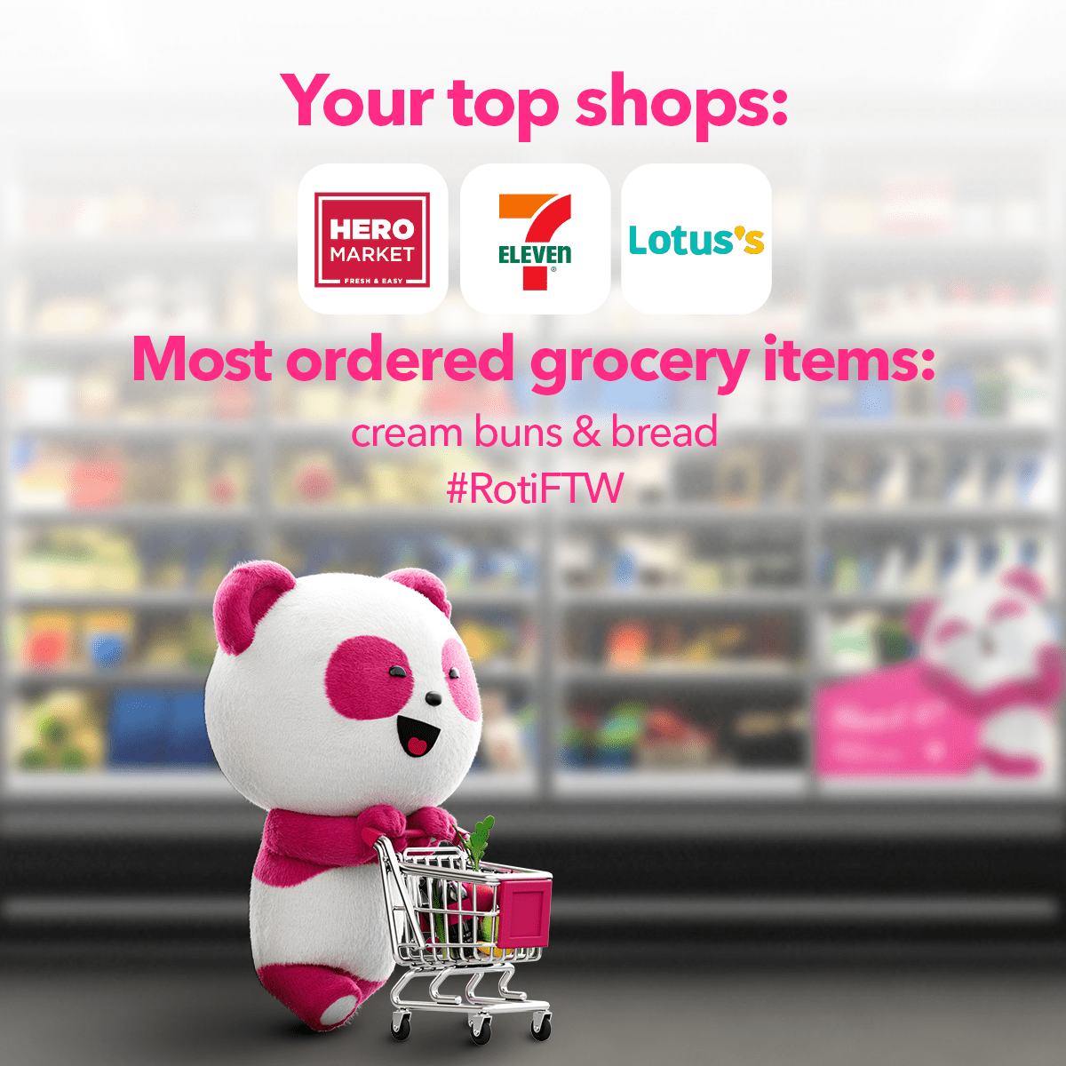 Cream rolls with chocolate filling are the most common orders from pandamart. Joining the list are white breads and eggs. Also, the top Shops on foodpanda are Lotus’s MY, HeroMarket and 7-Eleven (Groceries).