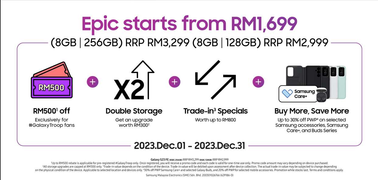 By joining the #GalaxyTroop, not only do you become part of an exciting community, but you also unlock a treasure trove of rewards. Kickstart your journey with the Galaxy S23 FE at an epic starting price of just RM1,699, after you apply all the amazing rewards.