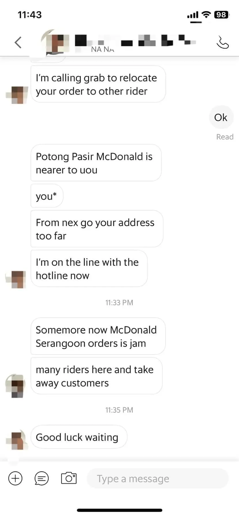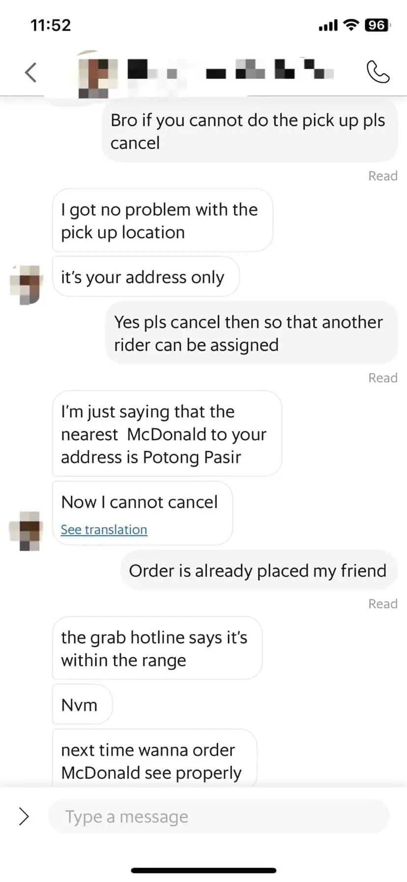 To his surprise, the rider messaged him, arguing that the McDonald’s at Potong Pasir was closer and that the journey from NEX to Ashvin’s address was too extensive.