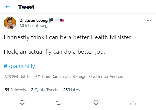 I honestly think I can be a better health minister. Heck, an actual fly can do a better job. #Spanish fly,” he said.