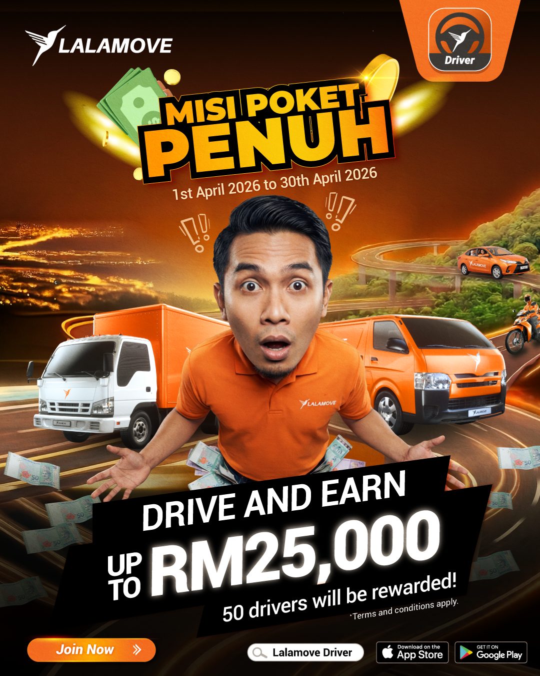 Join the “Misi Poket Penuh” campaign, complete more orders, and stand a chance to be among the top drivers winning up to RM25,000.