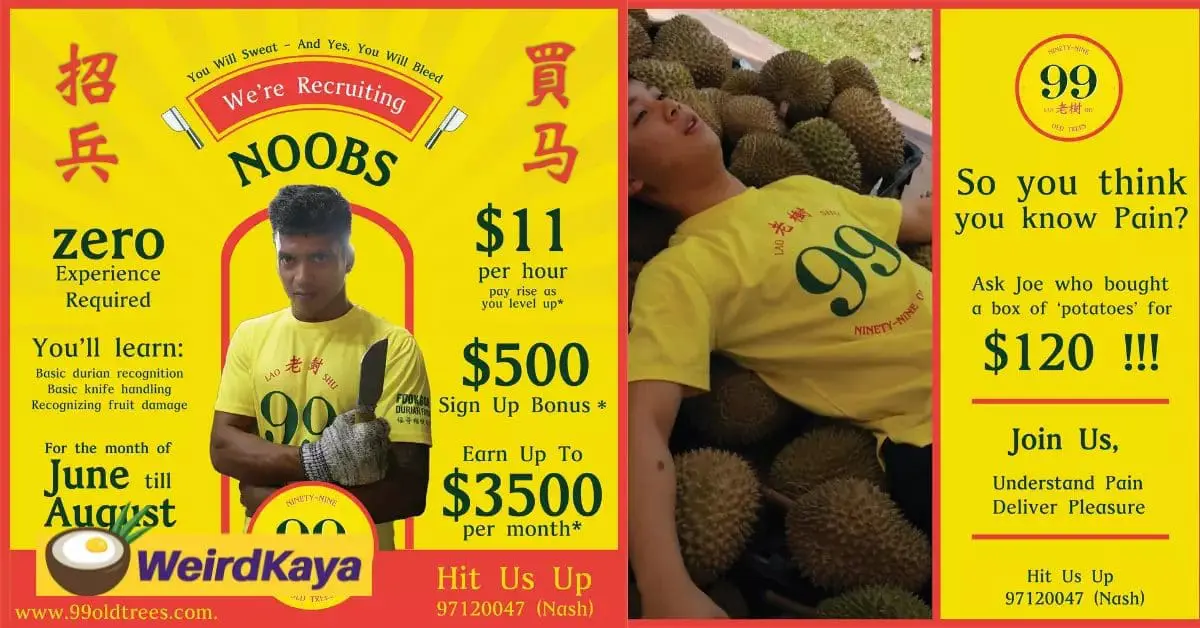 The store, named “99 Old Trees Durian”, posted a recruitment ad on their Facebook page which announced that the monthly salary is up to SGD3,500 (RM10.8K).