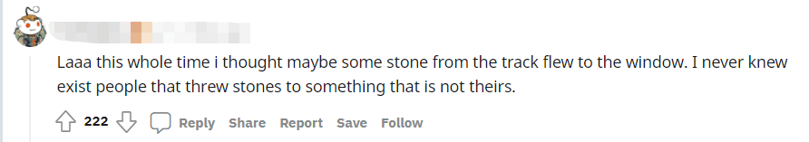 “This whole time I thought maybe some stones from the track flew to the window. I never knew exist [sic] people that threw stones to something that is not theirs.”