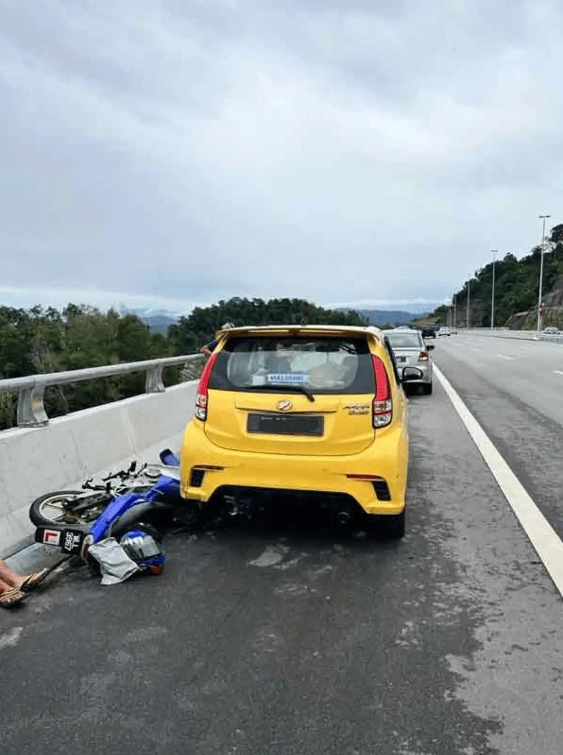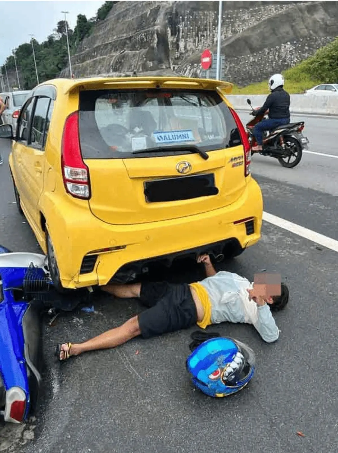 A motorcycle behind it could not hold his break in time and slammed into the car’s rear, causing both the person and the motorcycle to crash to the ground.