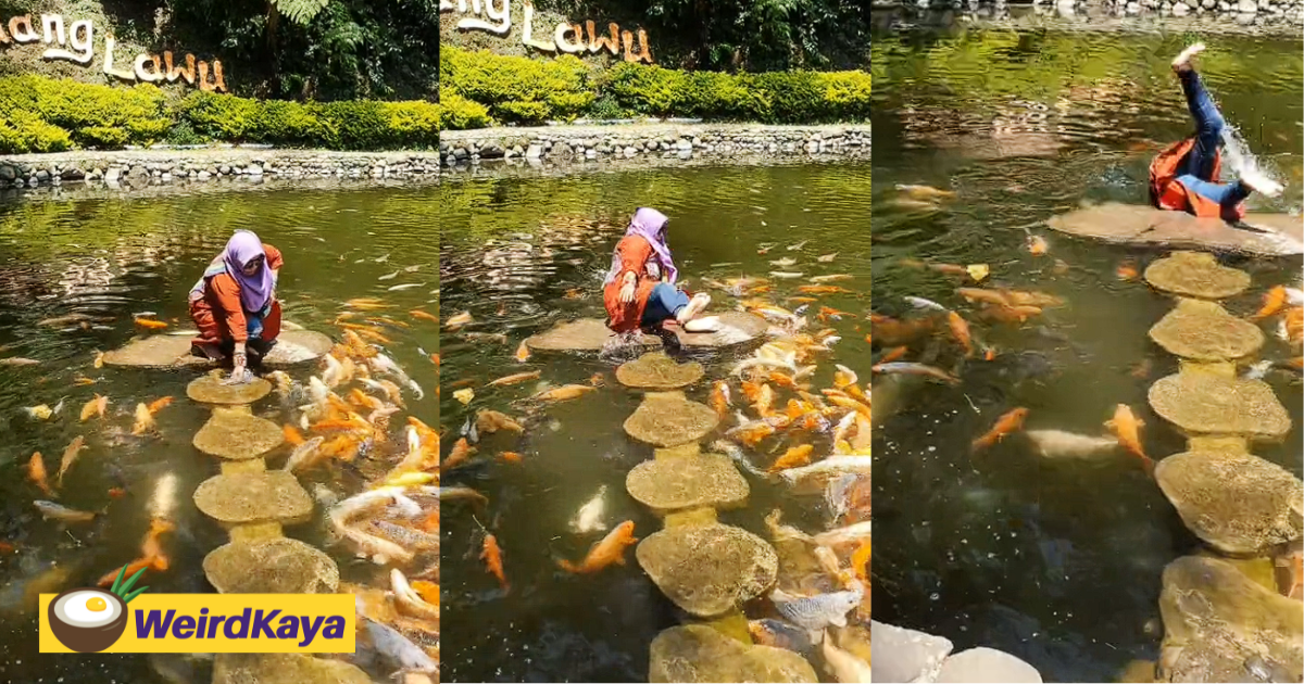 Indonesian Woman Hilariously Tumbles Into Carp Pond After She Loses Her Balance