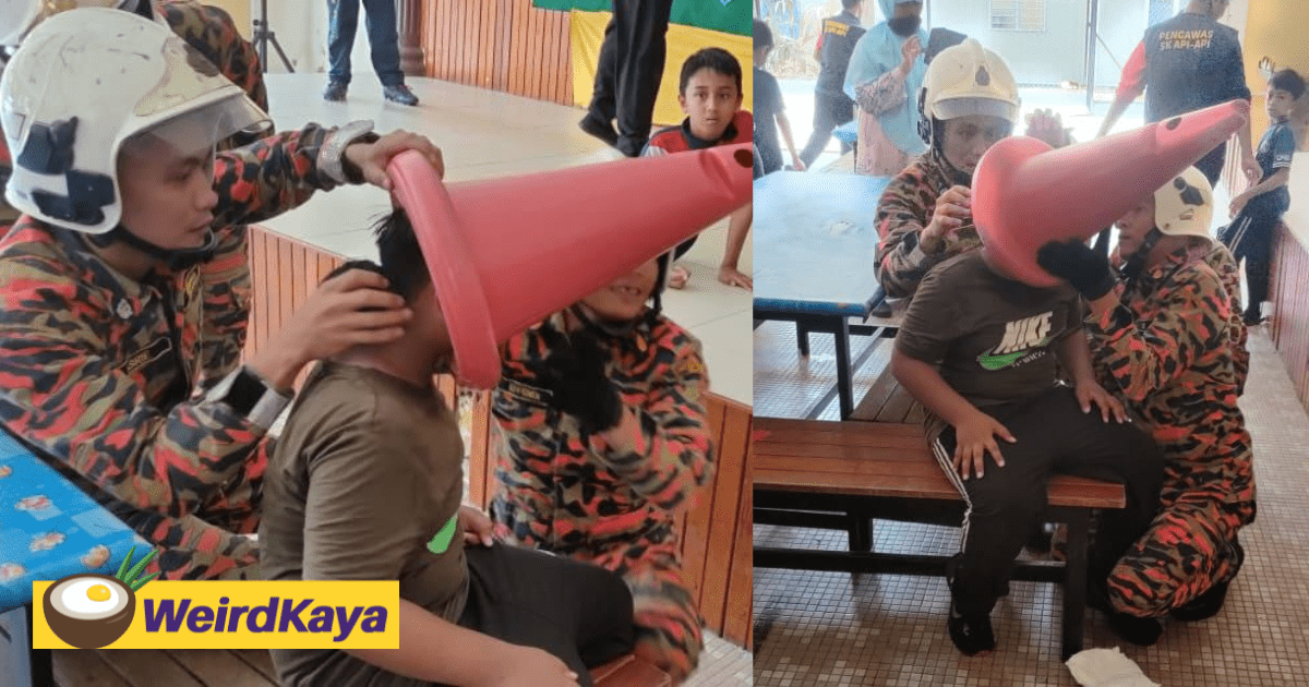 Firemen In Johor Free 10yo Boy’s Head Which Got Stuck Inside Traffic Cone Society September 28, 2022 Probably thought the cone had ice cream in it.