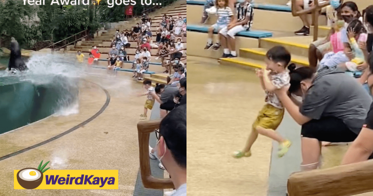 Mum uses her son as an umbrella to shield herself from getting splashed at S’pore Zoo