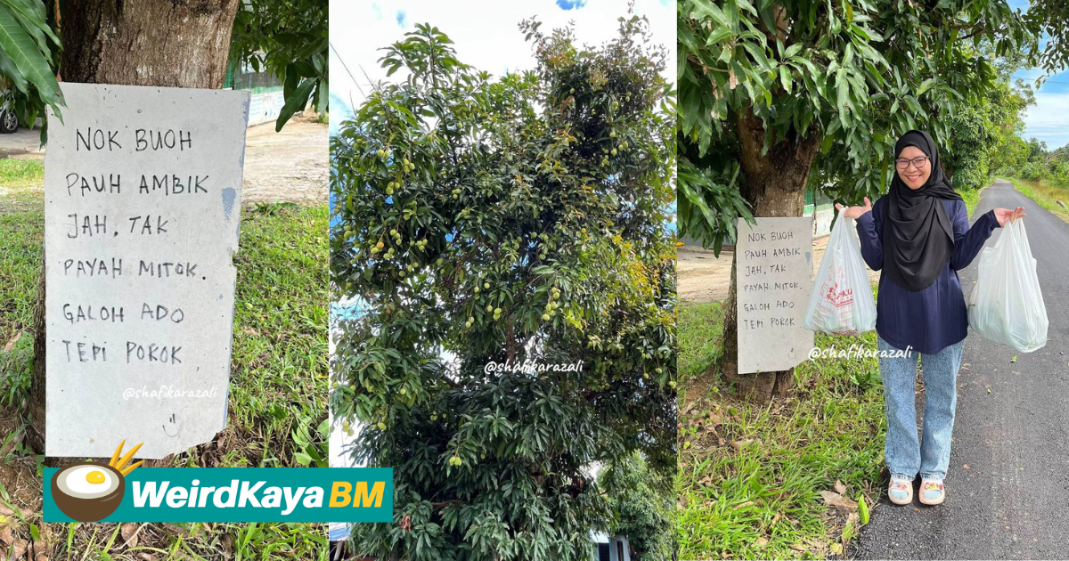 “Nok buoh pauh ambik jah, tak payah mitok. Galoh ado tepi pokok (nak buah mangga ambil saja, tak perlu minta. Galah ada tepi pokok),” isi nota tersebut.