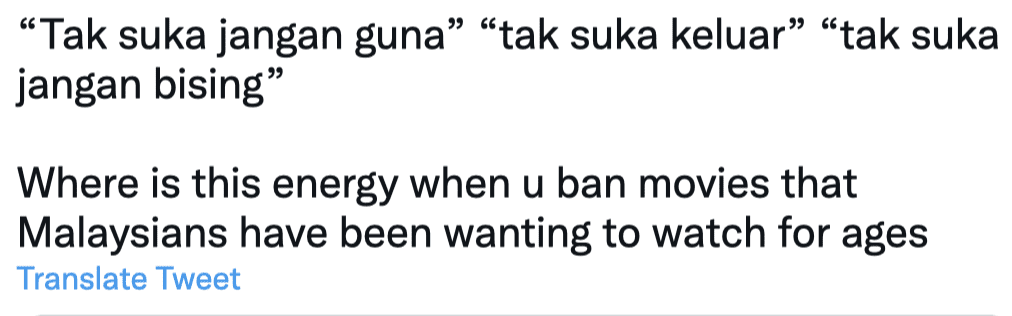 One sarcastically wrote: “‘Don’t like, don’t use.’ ‘Don’t like, get out.’ ‘Don’t like, don’t make noise.’ Where is this energy when you ban movies that Malaysians have been wanting to watch for ages?”