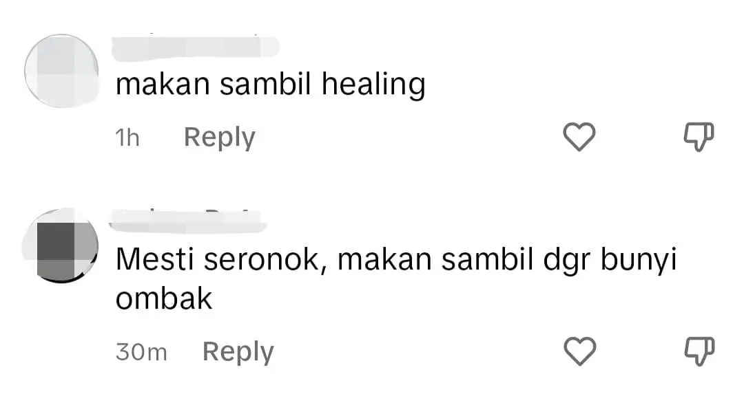 Menjengah ke ruangan komen, netizen teruja melihat keindahan pantai sambil menikmati hidangan yang enak dan tidak sabar untuk berkunjung ke cafe terbabit.