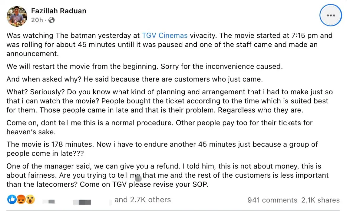 In a viral Facebook post, netizen Fazillah Raduan revealed that a staff member came in and told moviegoers that the entire movie would be restarted.