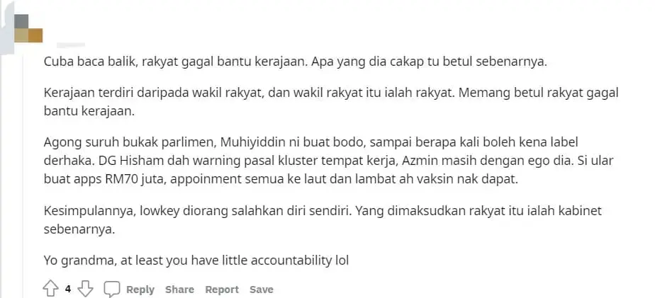 PETALING JAYA: “Malaysians who constantly accuse the government of failing to curb the pandemic are the ones to blame for the situation, not the other way round.”