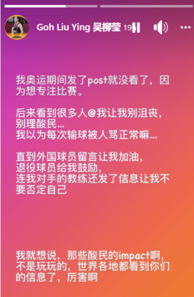 Goh wrote that she initially wasn’t aware of the negative comments directed towards her as she wanted to prepare for upcoming matches.