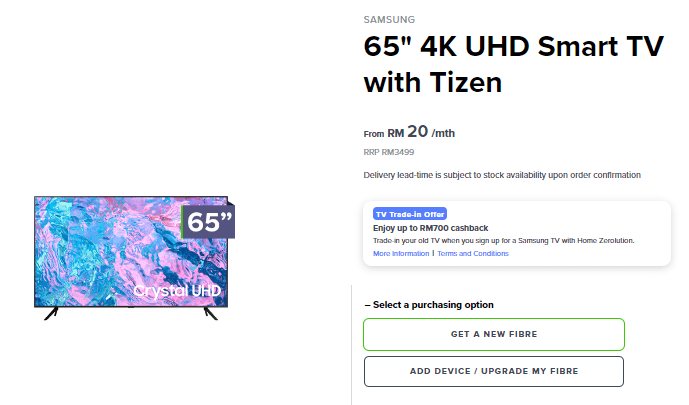 With any of their Maxis Home Fibre plans, you can get a Samsung 65″ 4K UHD Smart TV with Tizen from only RM20 monthly installment in Zerolution plan.