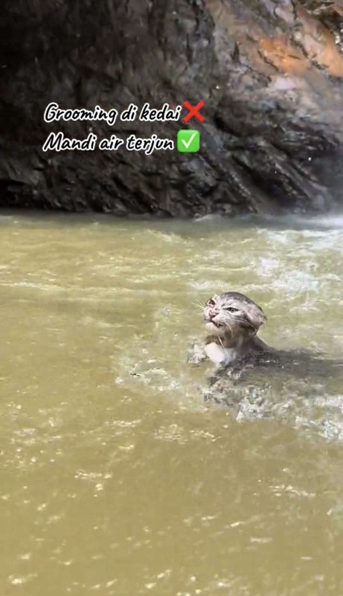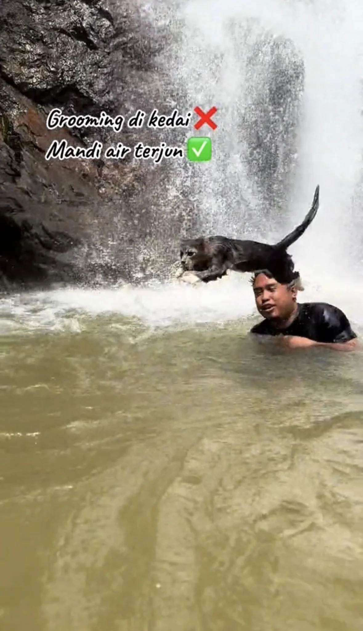 The caption written in the video reads, “Mochi’s first experience bathing at a waterfall… huhu. Practice makes perfect. Maybe next time he can become a national diver… his jump already has style.”