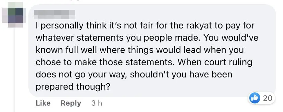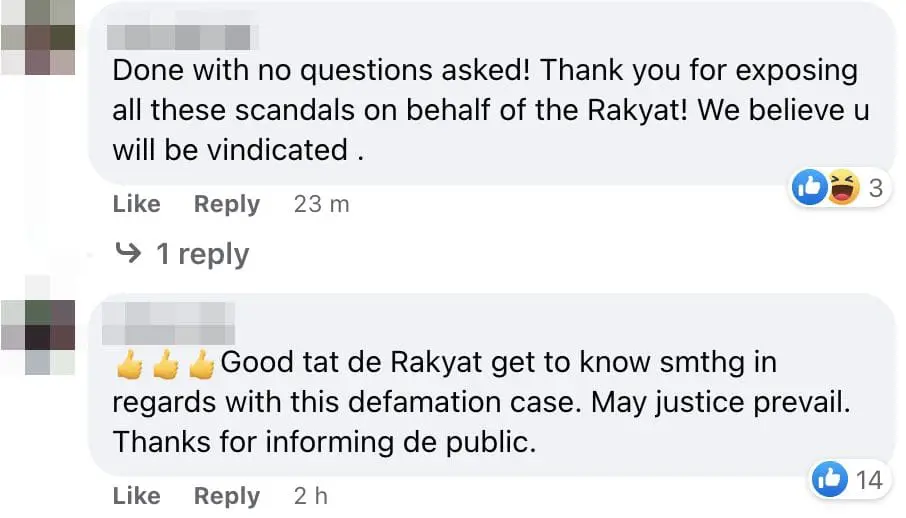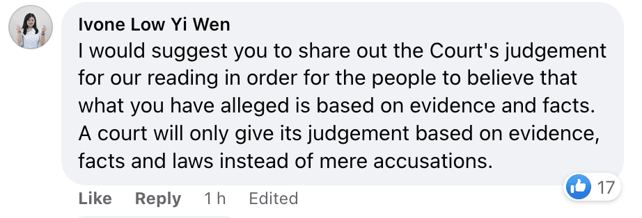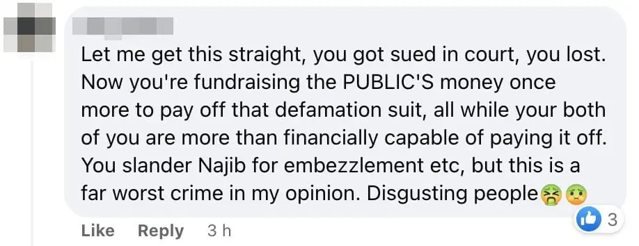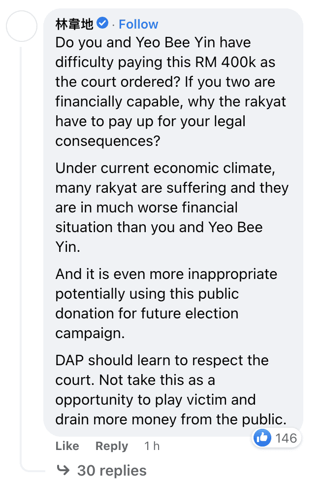 Author Lim Wooi Tee was also seen questioning Tony Pua’s action in the comment section and pointing out that it is inappropriate to use the donation funds for future election campaigns if the appeal is successful.