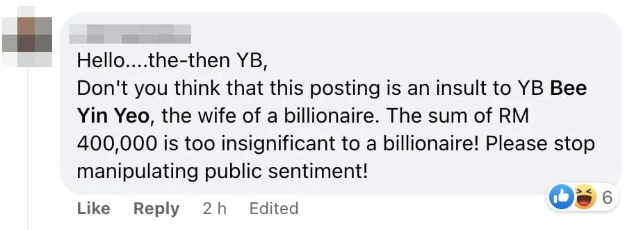Many were seen bashing the two as their asset should be able to afford the cost, highlighting Tony Pua, retired in his 40s as a finance elite in Singapore and Yeo Bee Yin, the wife of the IOI Groups, top 10 richest in Malaysia.