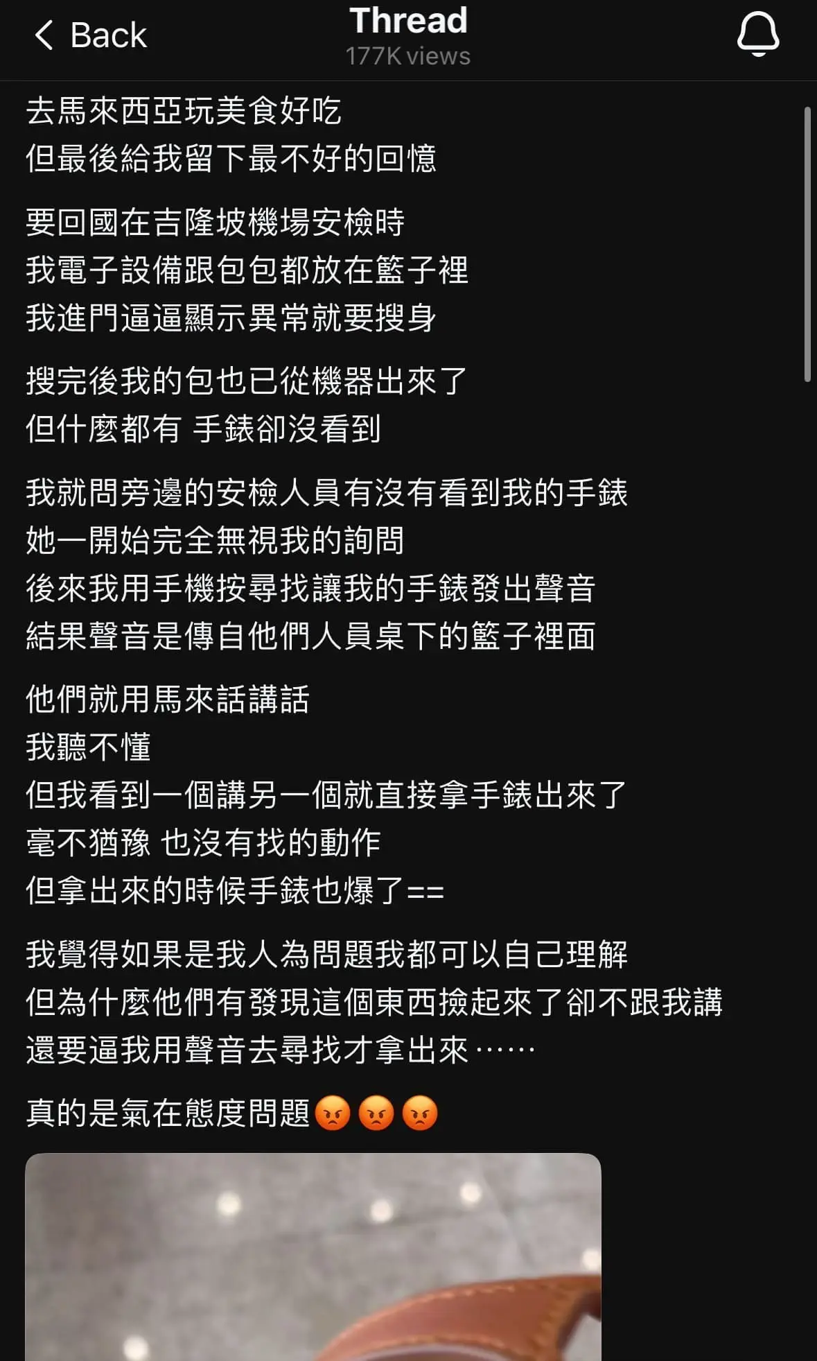 The traveller, who was flying out of Malaysia, recounted that during the airport security check, they placed their electronic devices and bag in a tray for screening.