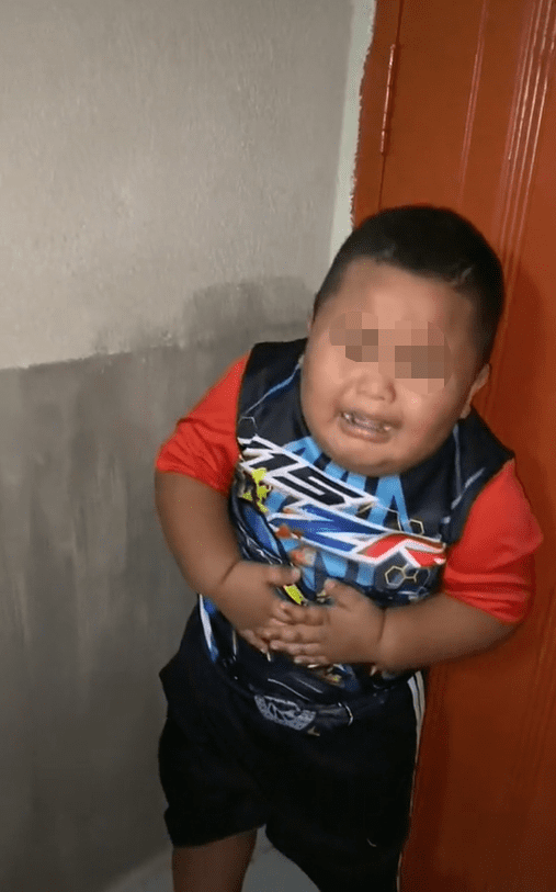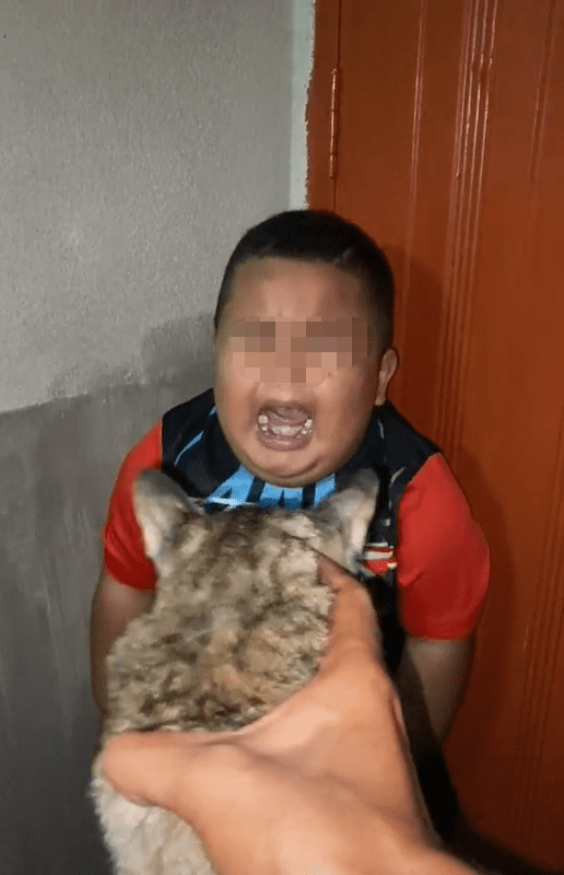 Despite the boy’s screams, the person continued to push the cat towards him, causing him to cower in fear while his back was against the wall.