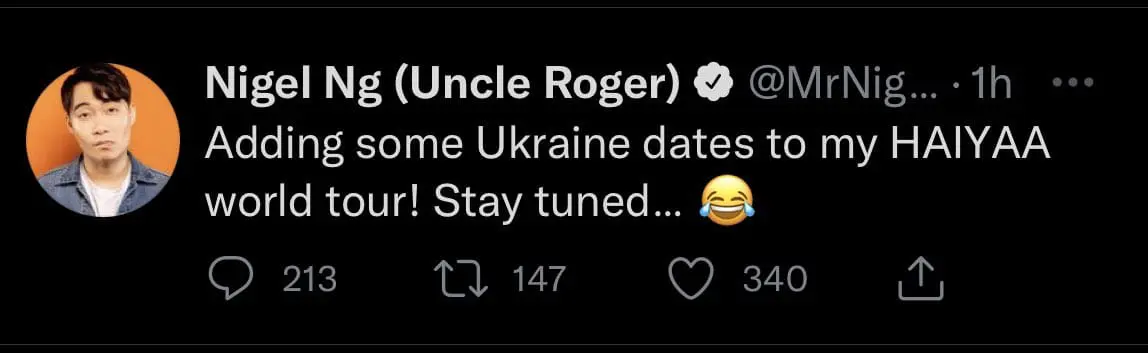 In a now-deleted tweet, Nigel Ng wrote in jest that he would be adding some ‘Ukraine dates’ to his upcoming HAIYAA World Tour and told fans to stay tuned for more Ukraine-themed jokes.