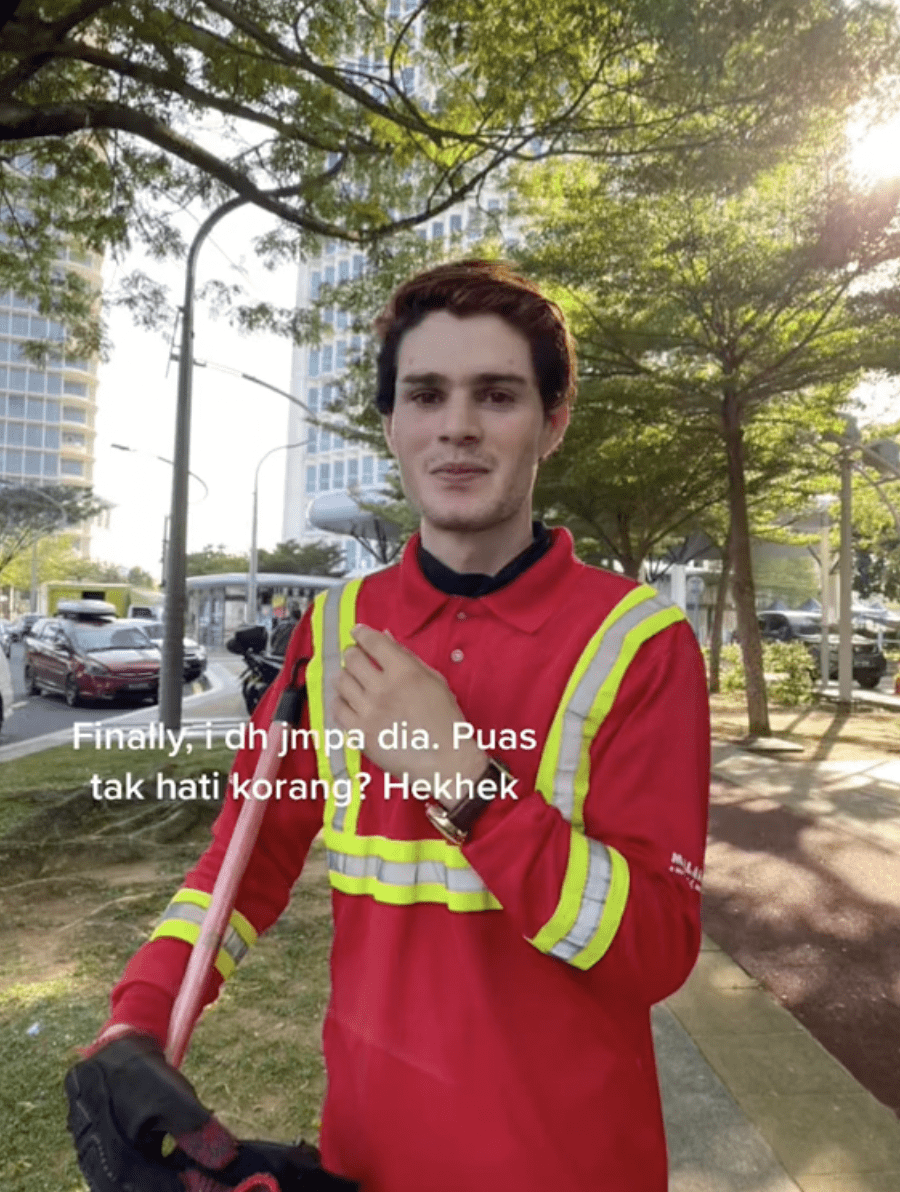 In a video posted by TikToker Maya Suhaimi, we can see the good looking foreigner clad in a red fluorescent t-shirt cleaning a rubbish bin at a public park in Putrajaya.