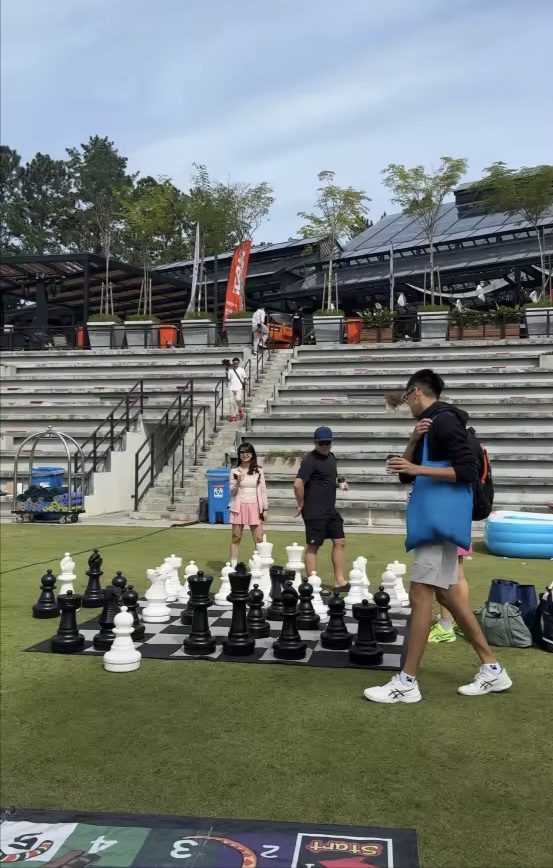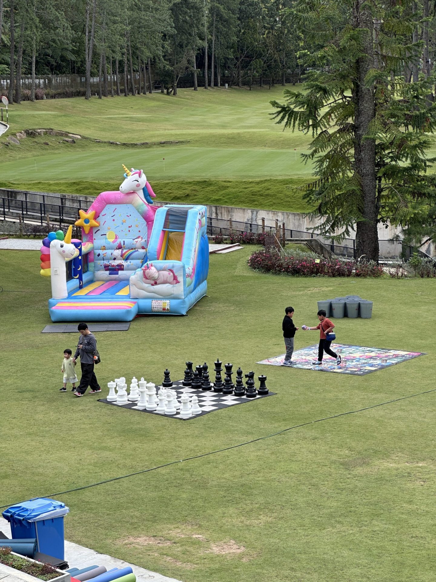 Children hopped between a colourful inflatable play area, a life-sized Snakes & Ladders board, a giant chess set, oversized throwing bins, and magnetic fishing pools.