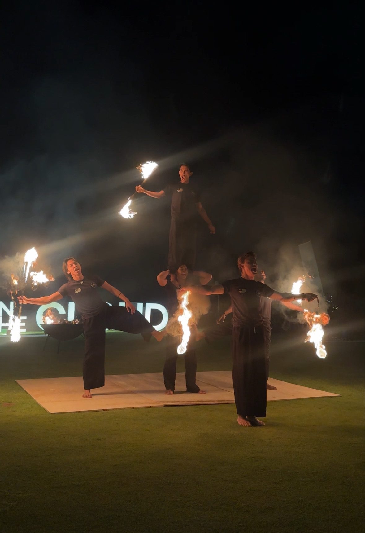 The performance erupted into action as performers commanded blazing flames with sharp precision and dramatic flair.