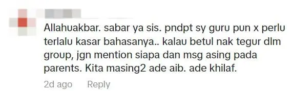 Another added, “Allahuakbar. Stay patient, sis. In my opinion, the teacher shouldn’t use such harsh language. If they genuinely want to address an issue in the group, they shouldn’t mention anyone by name and should message parents privately. We all have our shortcomings.”
