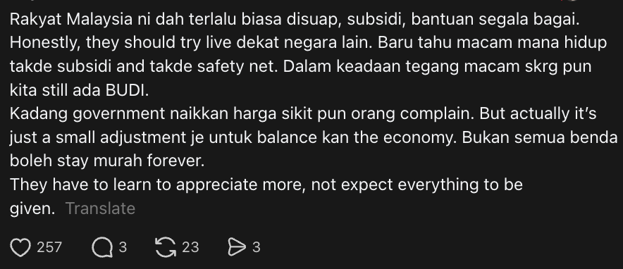 Many netizens agreed with the sentiment, saying Malaysians often overlook how subsidised essentials make daily life more manageable.