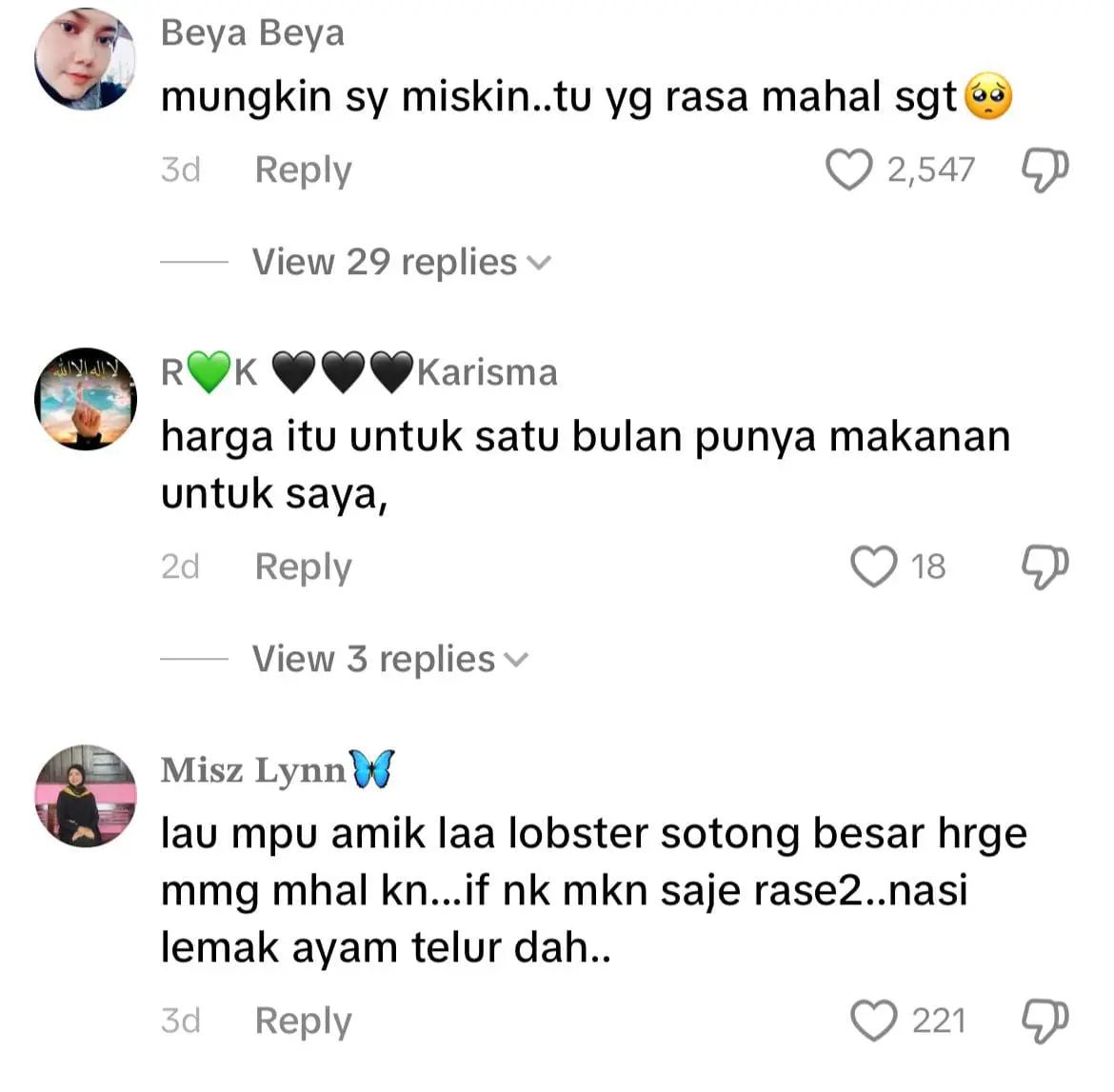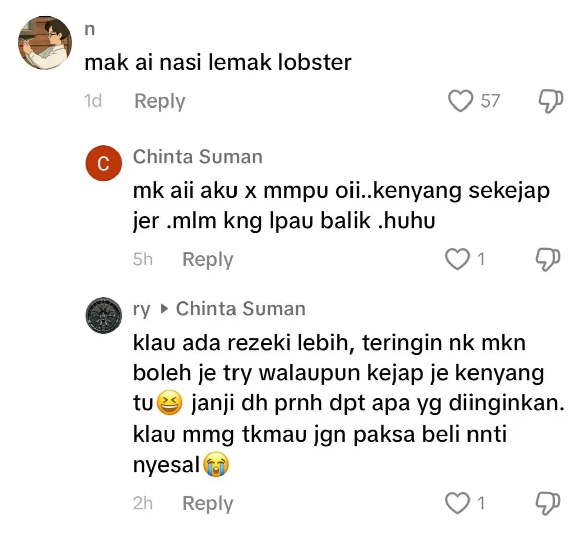 Meninjau ke ruangan komen, warganet terkejut melihat nasi lemak lobster yang dijual oleh Umi dan ada juga berpendapat harga tersebut amat berpatutan kerana seafood sedikit mahal berbanding lauk yang lain.