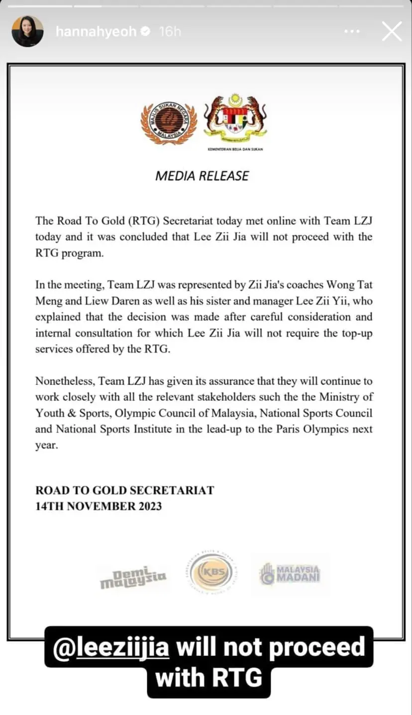 Youth and Sports Minister Hannah Yeoh had earlier mentioned that Zii Jia was the only athlete not yet part of RTG and had given him 14 days to decide, with today being the deadline.